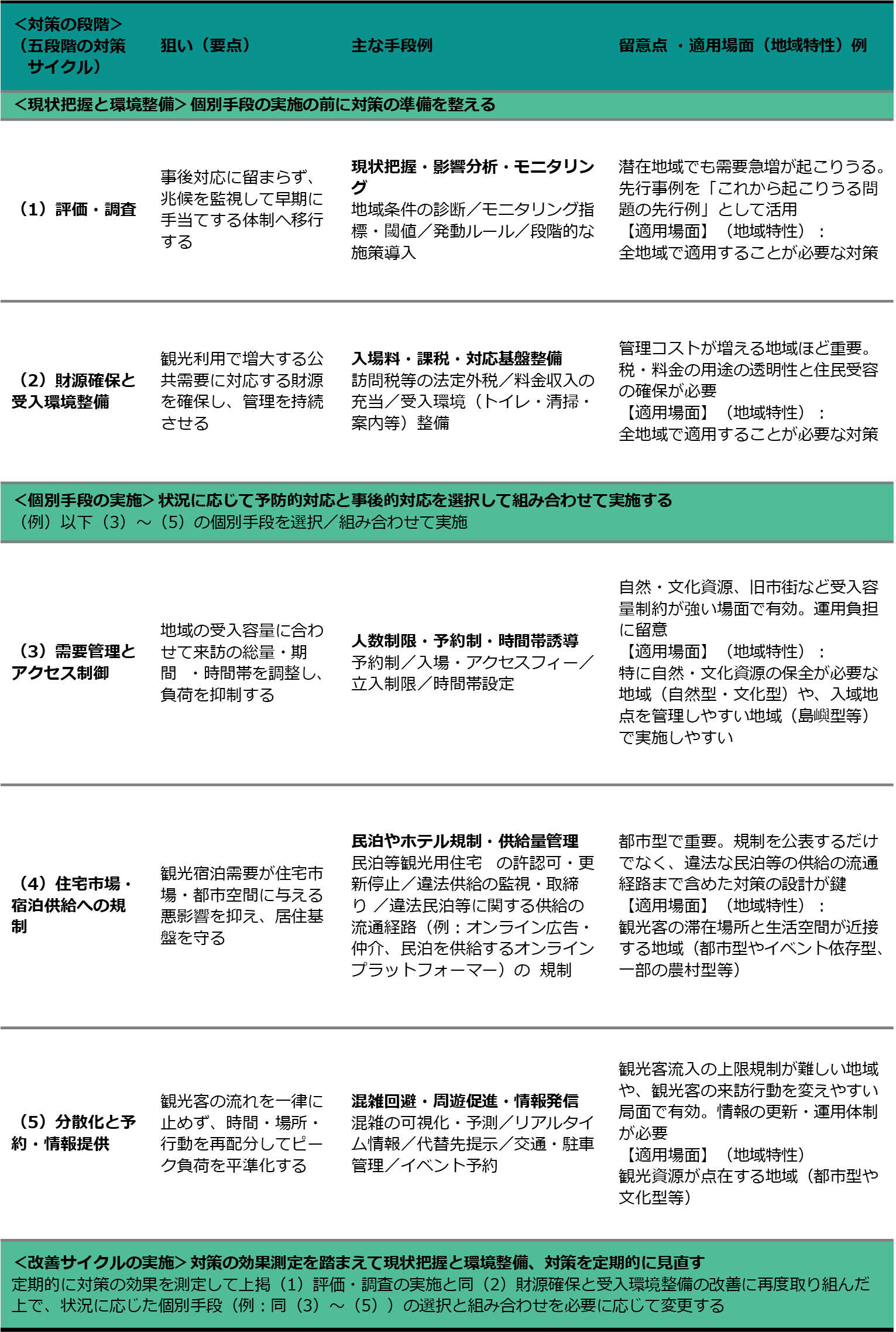 次に、オーバーツーリズム対策を実務で選択・実装可能な形に落とし込むため、ここまで本稿で解説してきた先進地における事例やその他の国内外の事例において効果的である取組を整理し、五段階の対策サイクルとしてまとめたものが以下の表である。